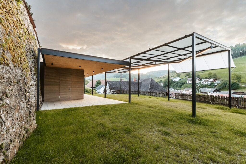In direkter Nachbarschaft zur denkmalgeschützten Kirchenmauer entstand auf dem Lindenplatz in Welschensteinach eine multifunktionale Überdachung mit angeschlossener Versorgungsbox. Diese kann über zwei großflächige Tore flexibel geöffnet und für Bewirtungszwecke genutzt werden. Der Neubau schafft einen geschützten, vielseitig nutzbaren Freiraum für Veranstaltungen im Zentrum der Gemeinde und fügt sich sensibel in den historischen Kontext ein.